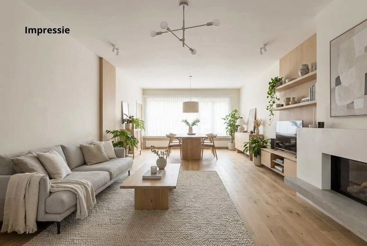 Via de inkomhal op de eerste verdieping, voorzien van een apart gastentoilet en vestiaire, betreden we de woning. Van hieruit komen we in de zeer royale leefruimte, die dankzij de grote raampartijen aan zowel de voor- als achterzijde geniet van een aangename lichtinval. Aansluitend bevindt zich de geïnstalleerde keuken, uitgerust met een gaskookvuur, dampkap, dubbele spoelbak, vaatwasser en koelkast.