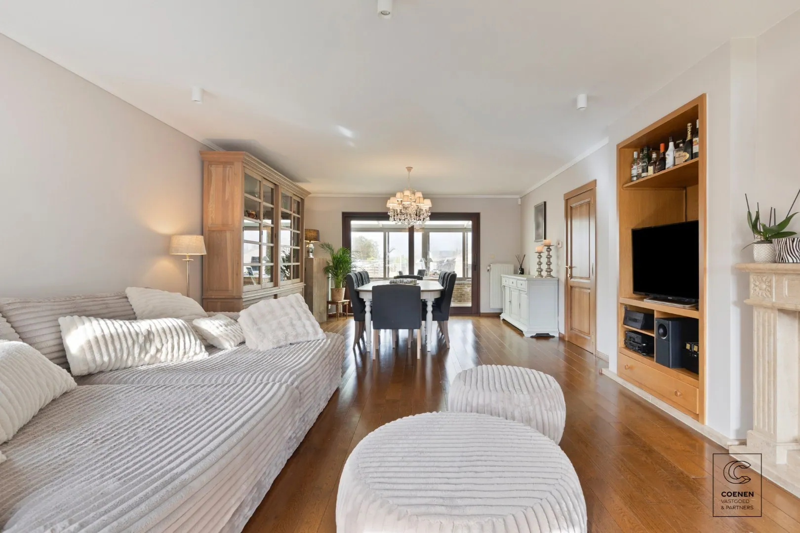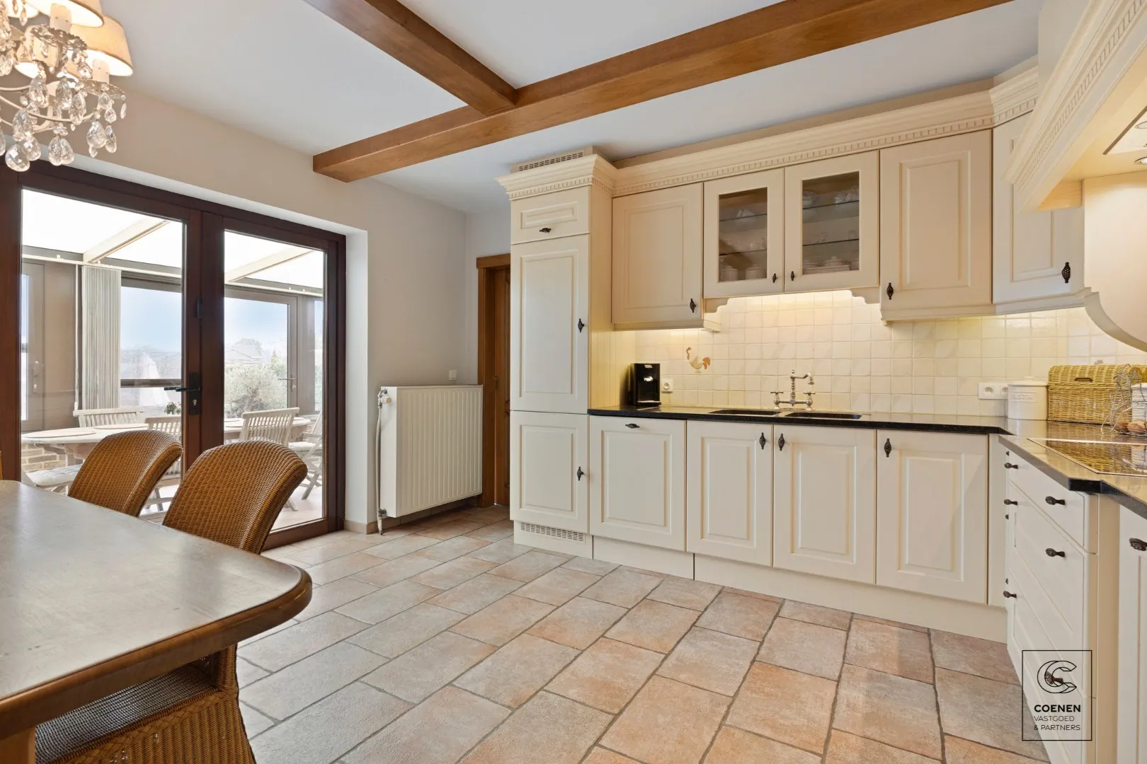 Bij het betreden van de woning kom je in een inkomhal op tegels, voorzien van een gastentoilet met handenwasser. Vanuit de hal krijg je toegang tot de gezellige leefruimte van 55 m² op parketvloer met veel lichtinval dankzij de vele ramen. Aansluitend bevindt zich de volledig ingerichte keuken (16 m²) op tegelvloer, voorzien van alle moderne comfort en met een naastgelegen bijkeuken met extra bergruimte. Vanuit zowel de leefruimte, als de keuken, is er toegang tot de veranda. Deze ruime veranda biedt een prachtig zicht op de verzorgde tuin en vormt een ideale plek om het hele jaar door van de buitenruimte te genieten.