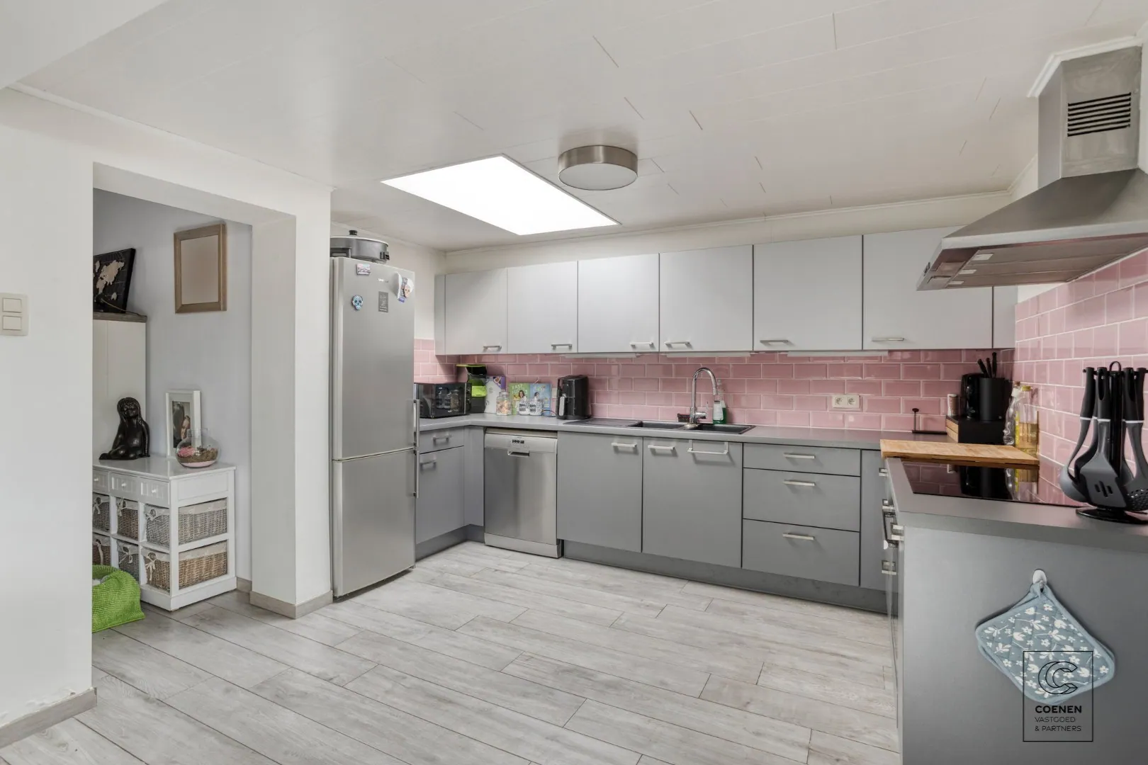 De keuken is uitgerust met een dubbele spoelbak, kookvuur, dampkap, koelkast met vriezer en ingemaakte kasten. Achter de keuken ligt een praktische, grote berging met extra kastruimte en aansluiting voor wasmachine en droogkast.