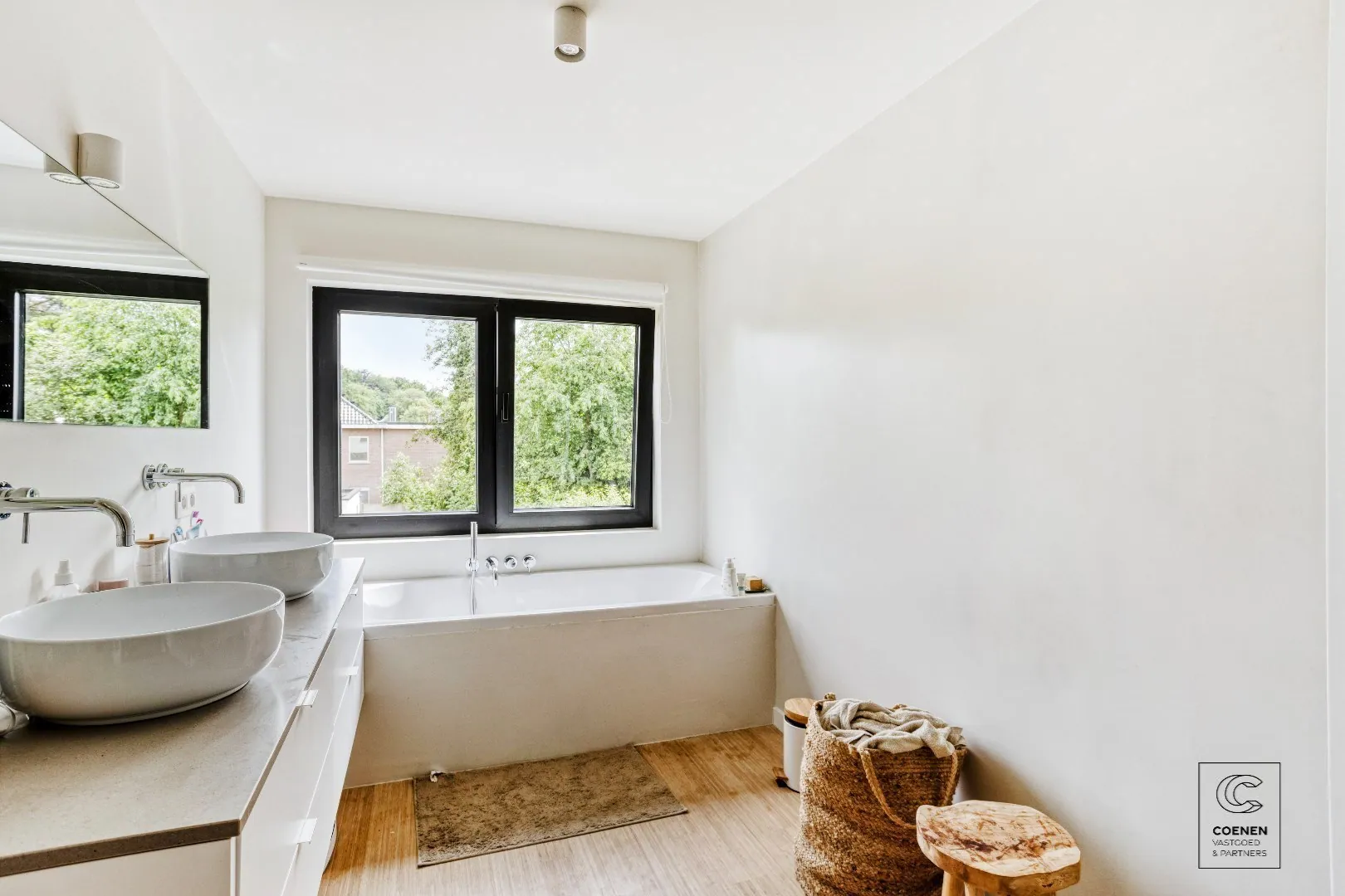 Op de eerste verdieping bevinden zich drie ruime slaapkamers, waarbij de master bedroom beschikt over een en-suite badkamer met douche en lavabomeubel. De hoofdbadkamer is voorzien van een ligbad, een in Mortex afgewerkte inloopdouche en een dubbel lavabomeubel. Een tweede, apart toilet vervolledigt deze verdieping. Achteraan de woning bevindt zich een ruime, zuidgerichte tuin met een aangelegd terras en een aparte opslagplaats/berging - huidige grond is breekzand dat was zorgt voor een makkelijke heraanleg.