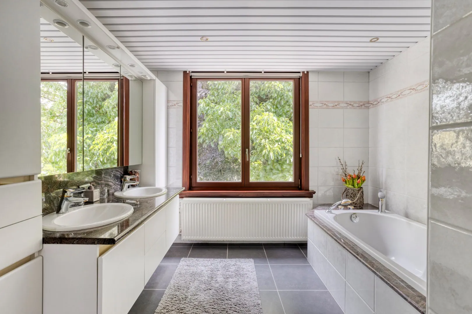 Op de eerste verdieping bevinden zich vier ruime slaapkamers van telkens ca. 24 m², een apart toilet en een badkamer uitgerust met een douche, ligbad en dubbele lavabo. De zolderverdieping biedt nog tal van mogelijkheden voor het creëren van extra slaapkamers of multifunctionele ruimtes.